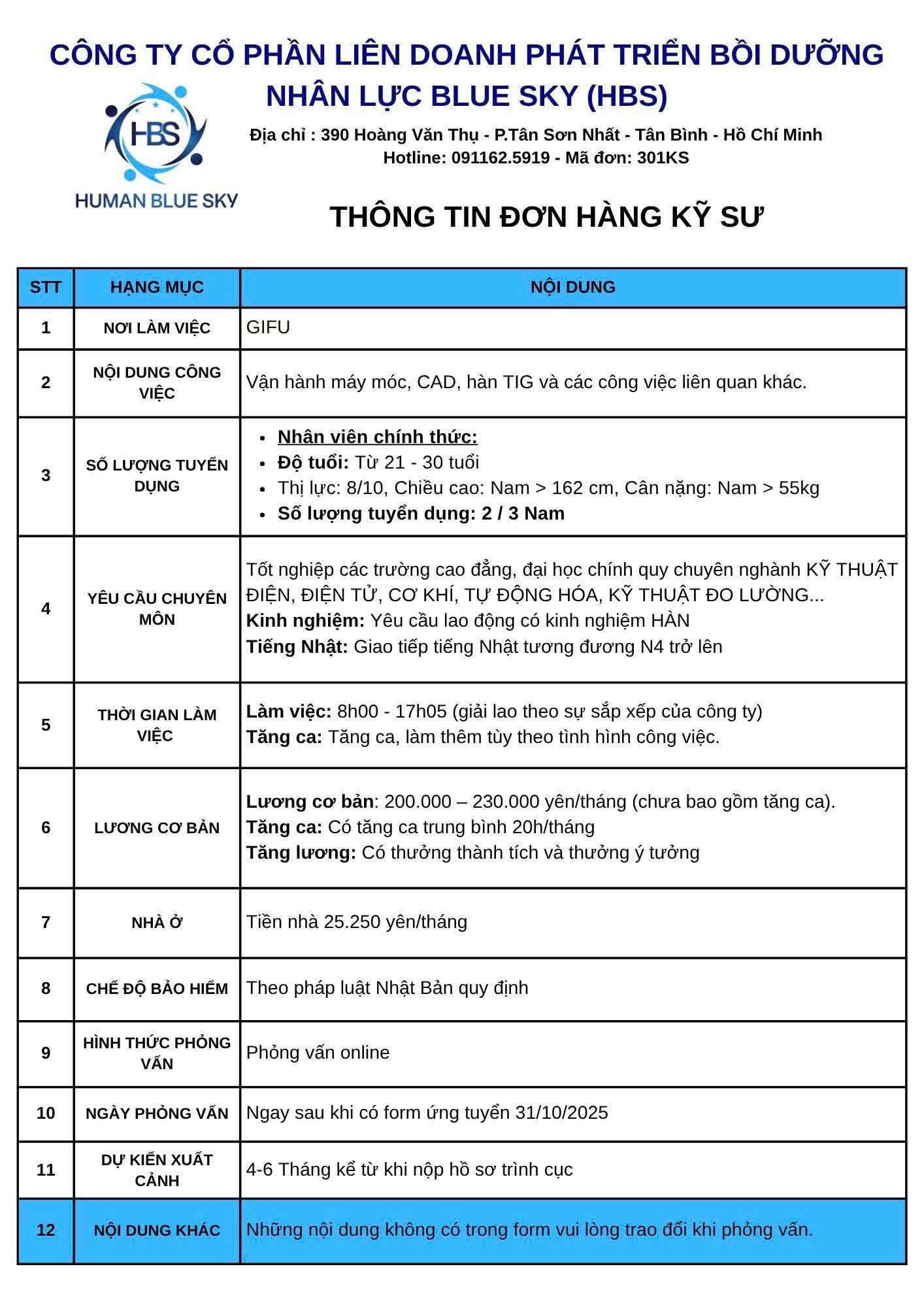 Liên hệ ngay với HBS qua Page Human Blue Sky hoặc số điện thoại 0911 625 911 ( Hotline/ zalo ) để được hướng dẫn đăng ký đơn vận hành máy. Xem thêm các đơn hàng kỹ sư Nhật Bản tại đây.