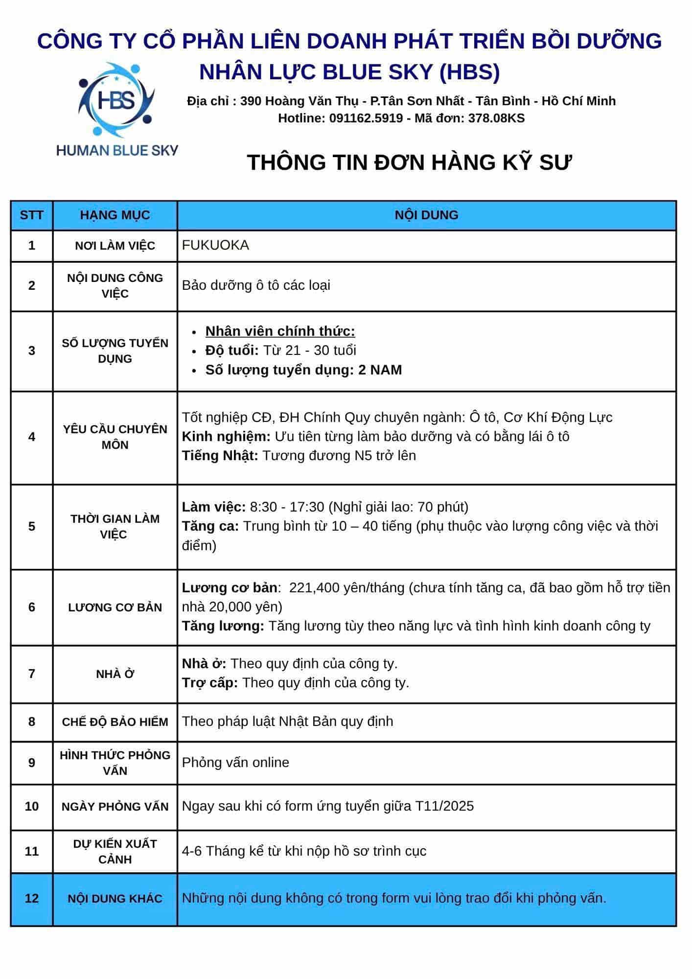 Liên hệ ngay với HBS qua Page Human Blue Sky hoặc số điện thoại 0911 625 911 ( Hotline/ zalo ) để được hướng dẫn đăng ký đơn vận hành máy. Xem thêm các đơn hàng kỹ sư Nhật Bản tại đây.