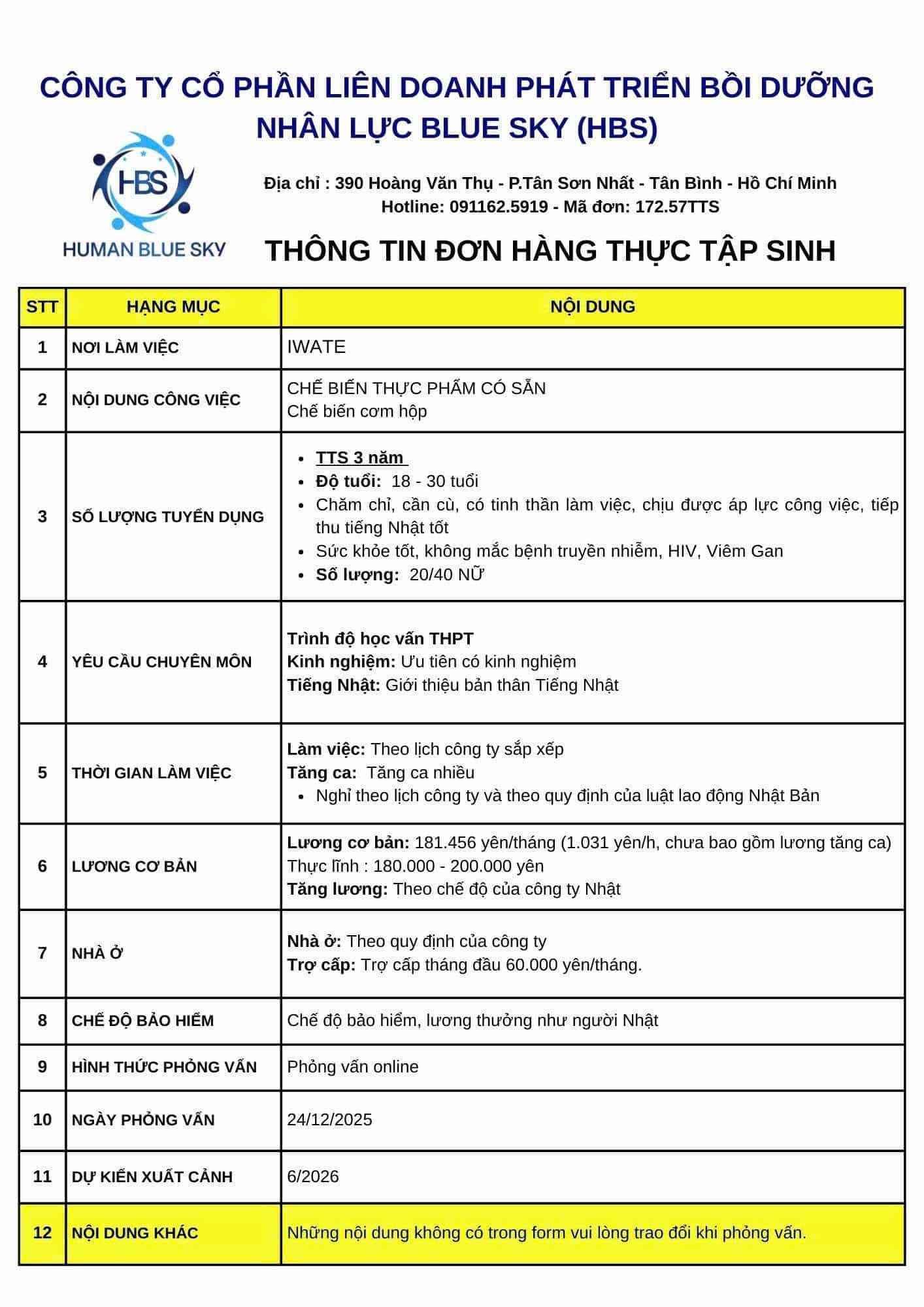 Liên hệ ngay với HBS qua Page Human Blue Sky hoặc số điện thoại 0911 625 911 ( Hotline/ zalo ) để được hướng dẫn đăng ký đơn vận hành máy. Xem thêm các đơn hàng XKLĐ Nhật Bản tại đây
