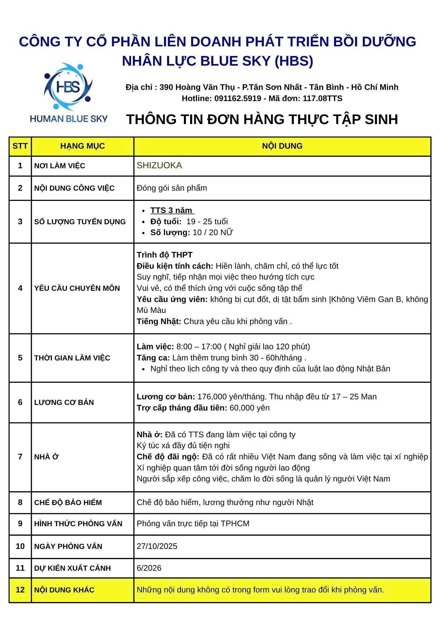 Liên hệ ngay với HBS qua Page Human Blue Sky hoặc số điện thoại 0911 625 911 ( Hotline/ zalo ) để được hướng dẫn đăng ký đơn vận hành máy. Xem thêm các đơn hàng XKLĐ Nhật Bản tại đây.