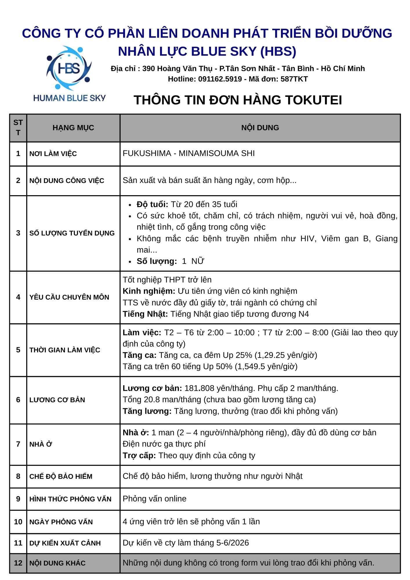 Liên hệ ngay với HBS qua Page Human Blue Sky hoặc số điện thoại 0911 625 911 ( Hotline/ zalo ) để được hướng dẫn đăng ký đơn vận hành máy. Xem thêm các đơn hàng XKLĐ Nhật Bản tại đây