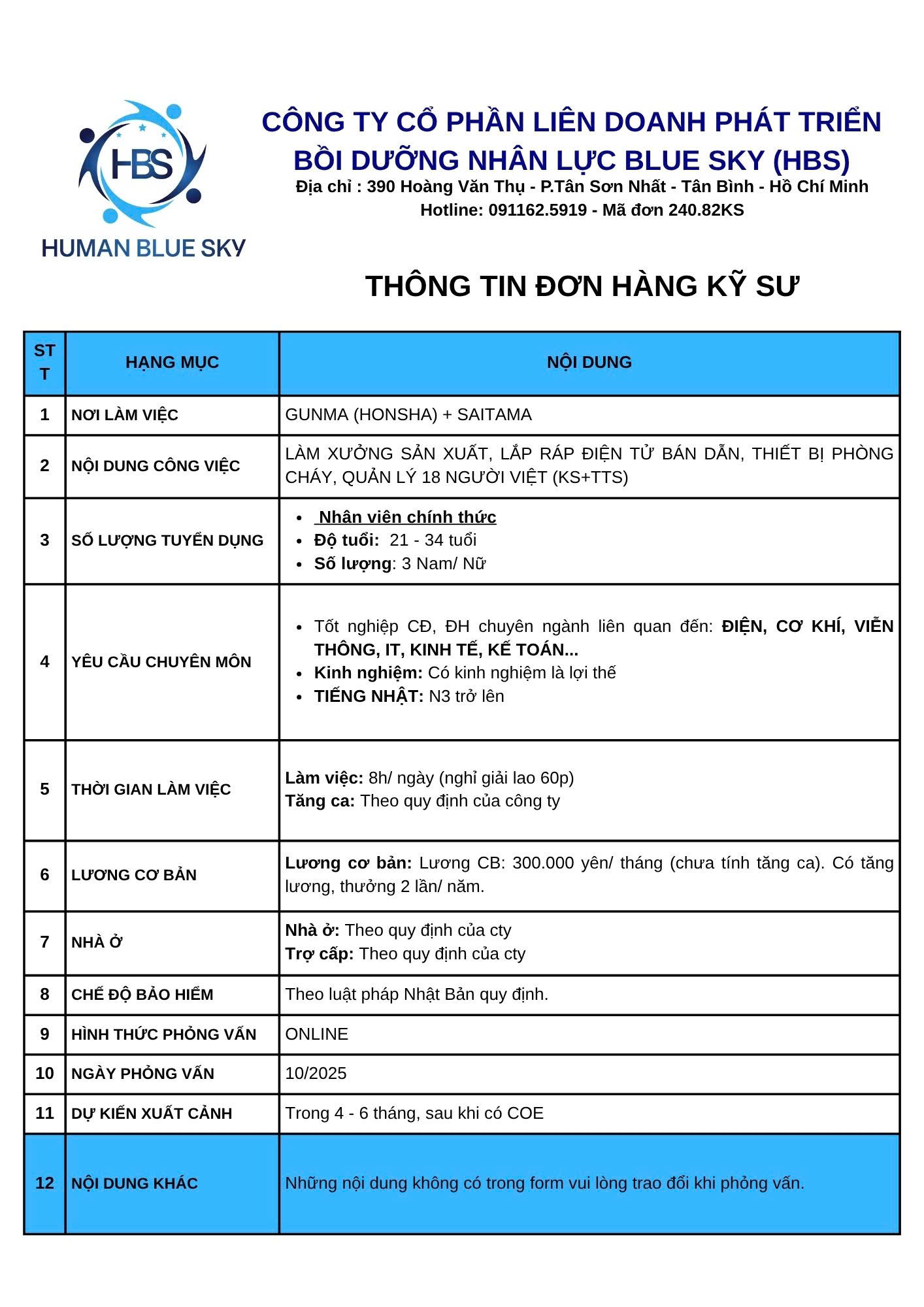 Liên hệ ngay với HBS qua Page Human Blue Sky hoặc số điện thoại 0911 625 911 ( Hotline/ zalo ) để được hướng dẫn đăng ký đơn vận hành máy. Xem thêm các đơn hàng kỹ sư Nhật Bản tại đây.
