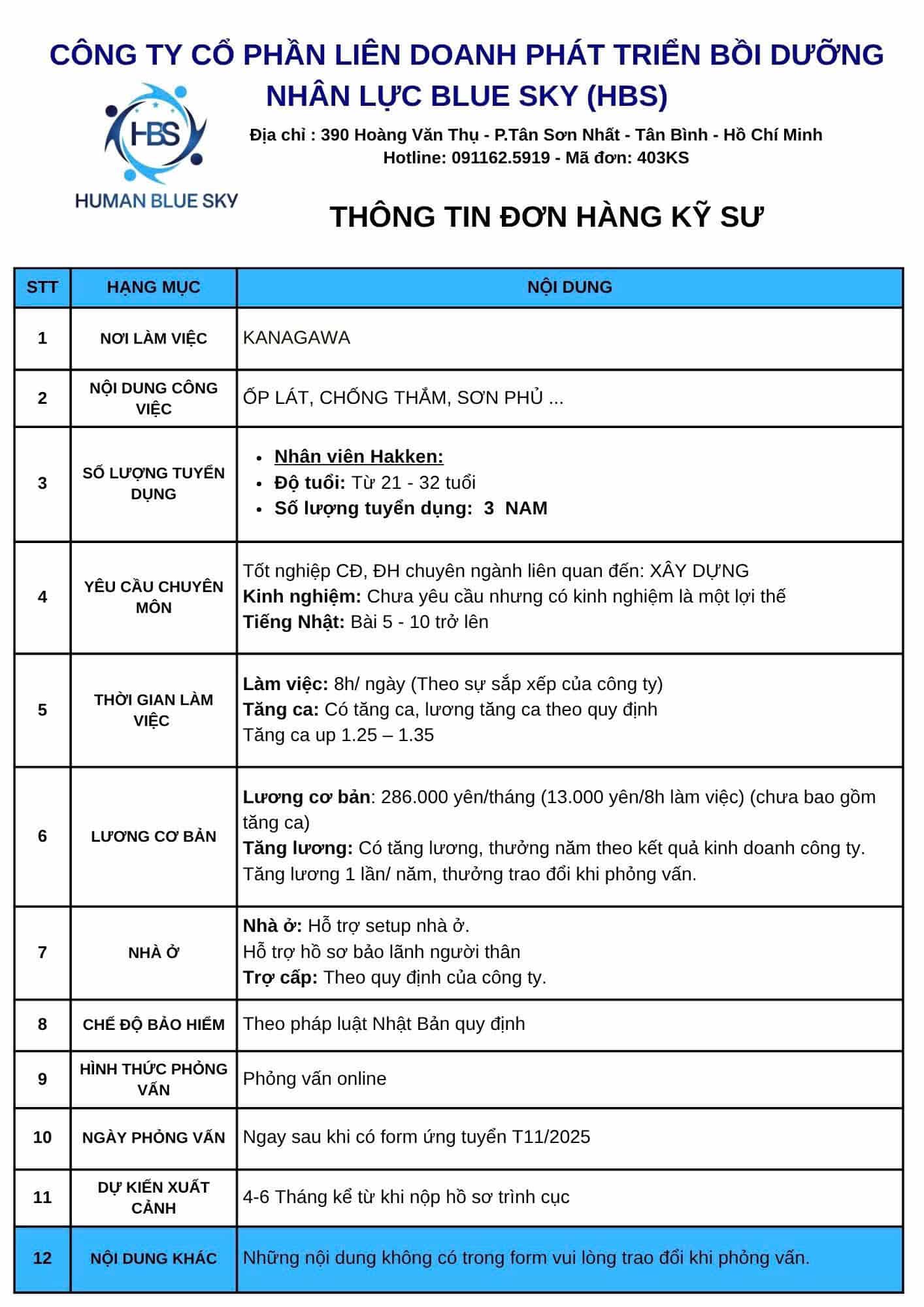 Liên hệ ngay với HBS qua Page Human Blue Sky hoặc số điện thoại 0911 625 911 ( Hotline/ zalo ) để được hướng dẫn đăng ký đơn vận hành máy. Xem thêm các đơn hàng kỹ sư Nhật Bản tại đây.