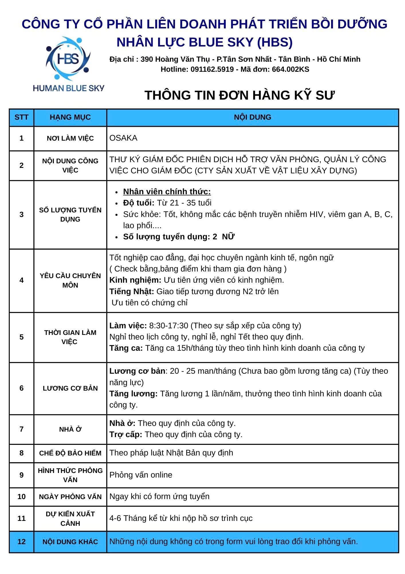 Liên hệ ngay với HBS qua Page Human Blue Sky hoặc số điện thoại 0911 625 911 ( Hotline/ zalo ) để được hướng dẫn đăng ký đơn vận hành máy. Xem thêm các đơn hàng kỹ sư Nhật Bản tại đây.